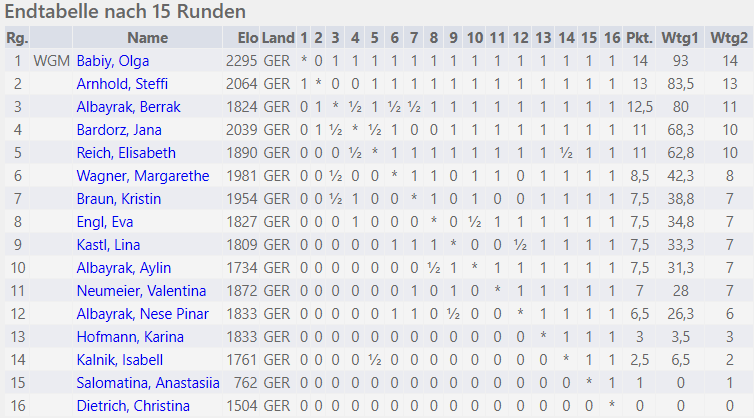 Ganz konnte die Spitzenreiterin ihre weiße Weste nicht bis ins Ziel retten. Im letzten Durchgang luchste Steffi Arnhold der Women Grand Master noch einen Punkt ab. Das änderte aber nichts mehr am Ergebnis ganz vorne. Bayerische Meisterin im Blitzschach 2025 wurde WGM Olga Babiy.