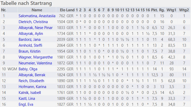 16 Teilnehmerinnen hatten sich in Loni-Übler-Haus des Gastgebers SC Noris-Tarrasch Nürnberg eingefunden. Neben einer Titelträgerin und der ein oder anderen Bundesligaspielerin wagten sich auch einige U20-Nachwuchstalente an den Start.