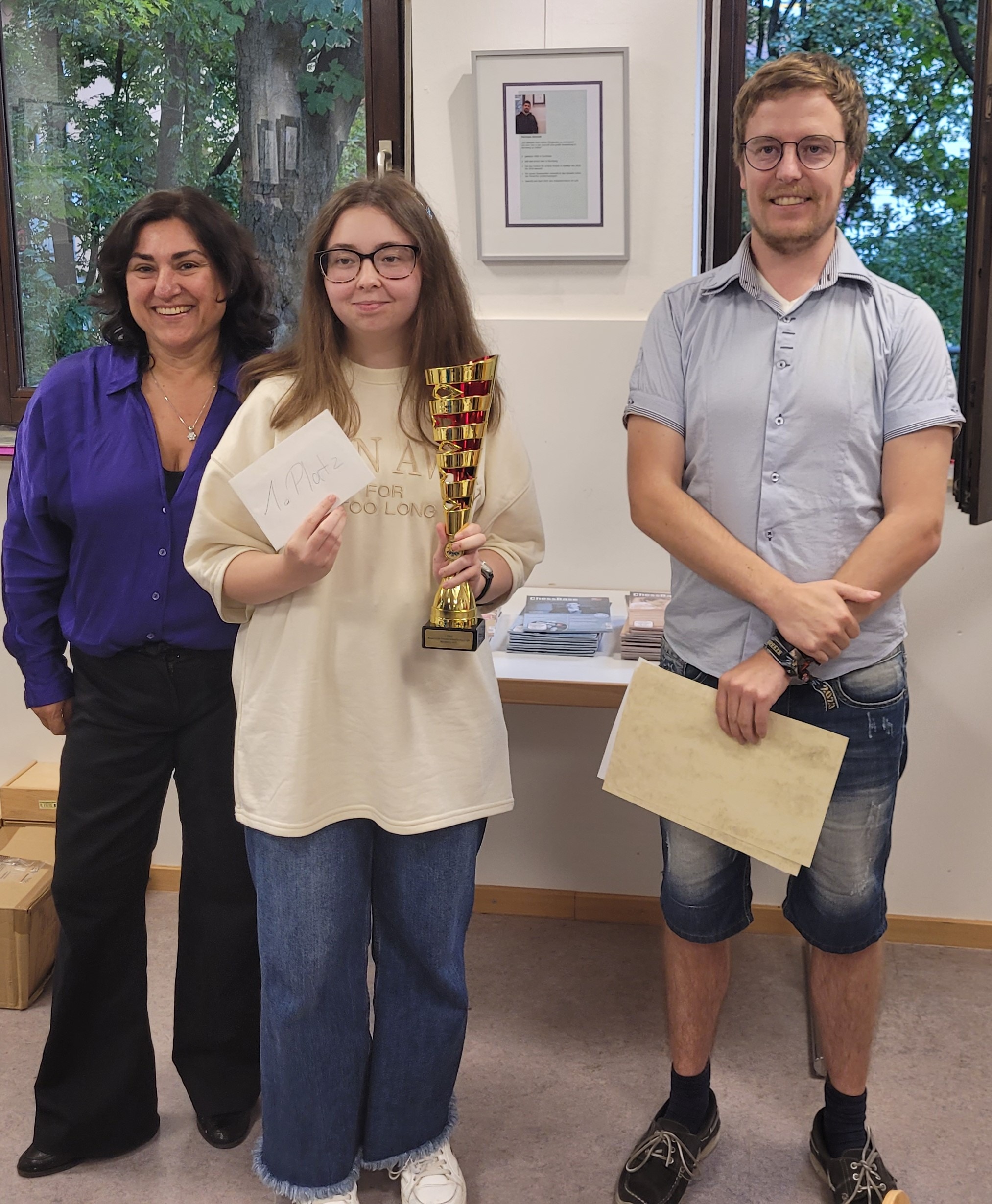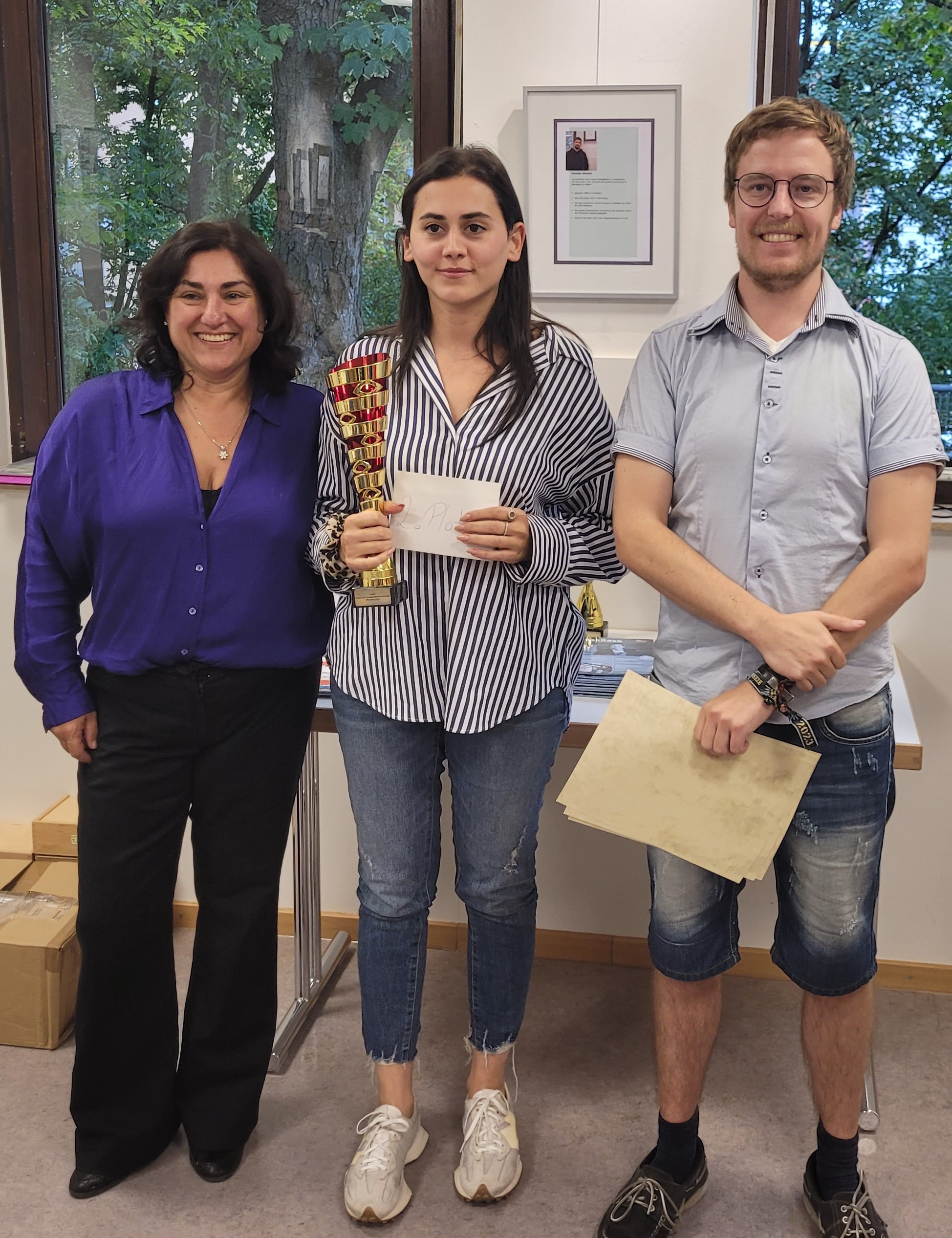 Die glückliche Gewinnerin,Irmgard Narr Ü80, der Partien-Analyse mit IM Yevhenii war überrascht auf ihren Preis, meinte aber, “sie hätte jede Menge bereits gespielte Partien zur Auswahl:)!”